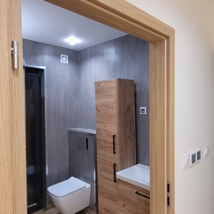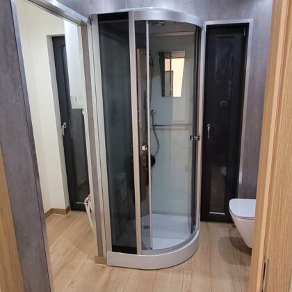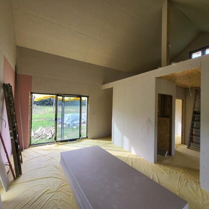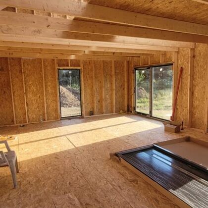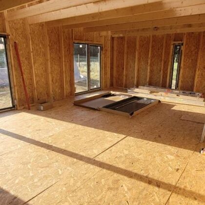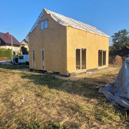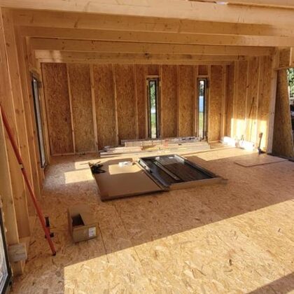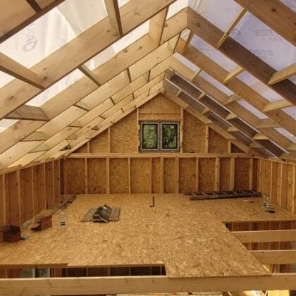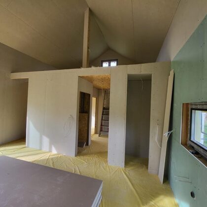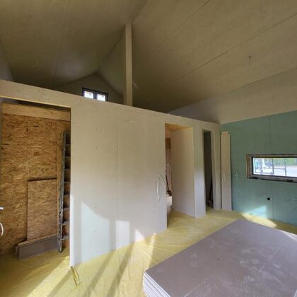 (8,5m x 6m) Salon z aneksem kuchennym + łazienka + sypialnia + pom. gospodarcze + antresola